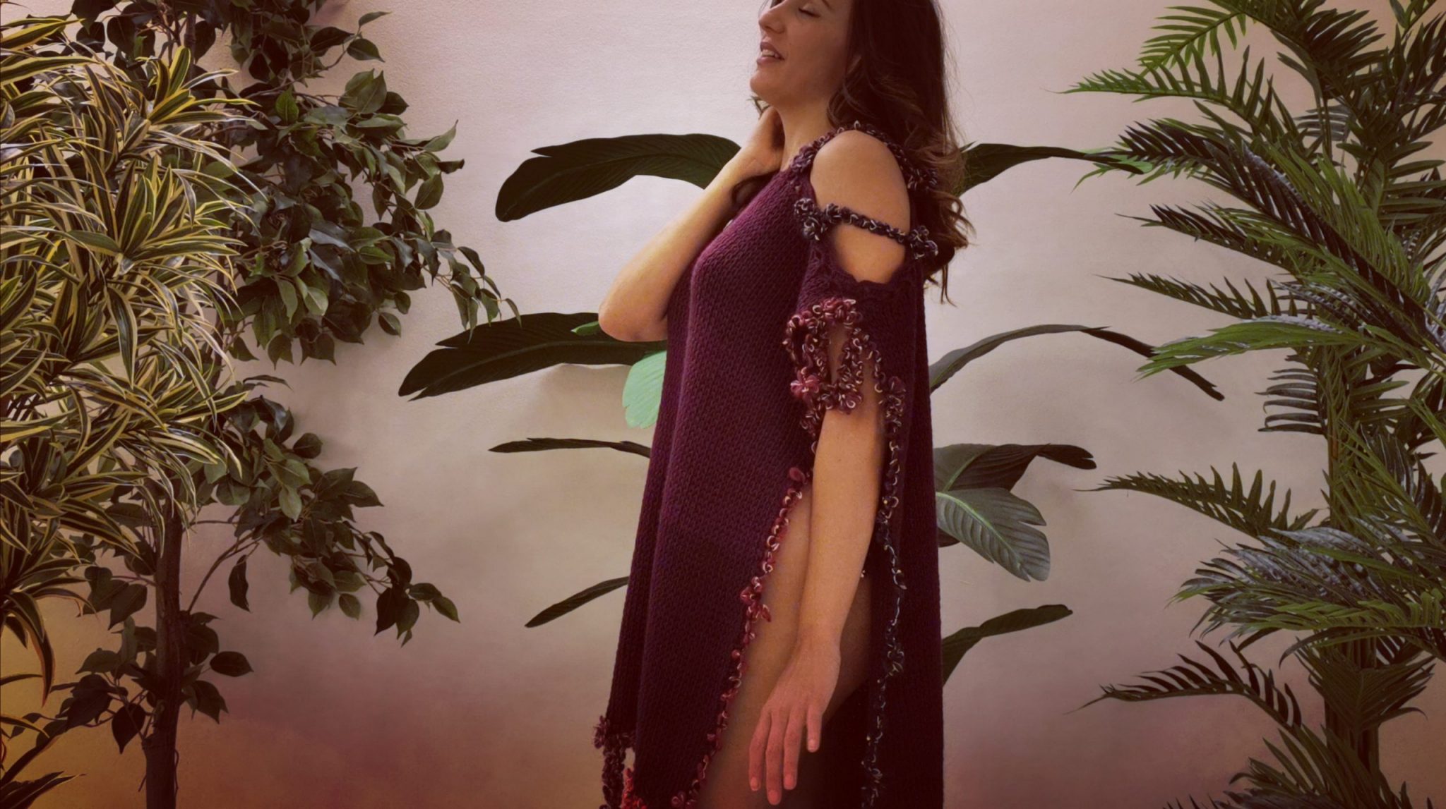 Raffinata stola blusa copri spalle realizzata con morbidissimo filato di lana colore melanzana