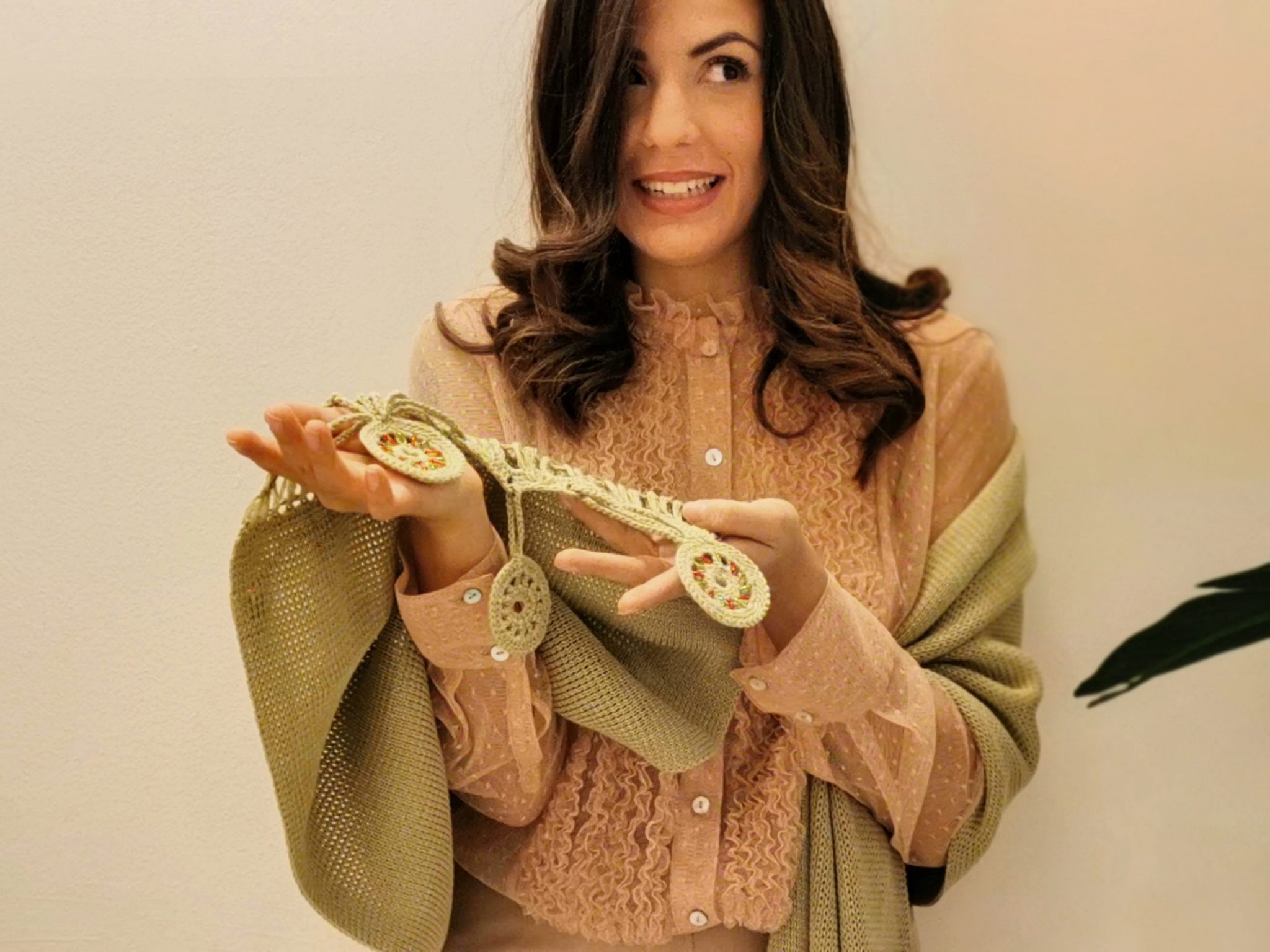 Elegante sciarpa in delicato filato verde pistacchio, una fine maglia rifinita con eleganti balze uncinetto impreziosite deliziose ruote di carretto rifinite da perline, cristalli in tinta e strass.