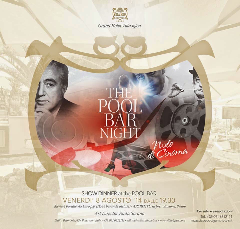 Vi aspettiamo Venerdi 08 Agosto presso le splendide terrazze del Pool Bar del Grand Hotel Villa Igiea per una serata dalle atmosfere senza tempo, con musica dal vivo che vi accompagnerà in uno splendido viaggio attraverso la storia del grande cinema, immersi fra le note delle più famose colonne sonore. A realizzare gli Artmovements Group . Solista : Rosi Oliva Key Boards: Cammarata Giuseppe Electric & Acoustic Bass: Davide Puccio Drums: Alessandro Amato Alto & Tenor Sax: Stefano Basile Guitar: Zoppi Giulio .