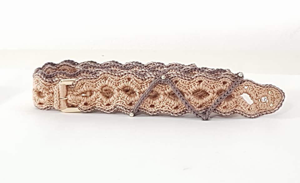 Pure slate colored cotton belt alternated with antique pink cotton. Refined texture composed of a fan fantasy. Belt worked with the ancient crochet technique, made entirely by hand. Big buckle. Single article not reproducible.