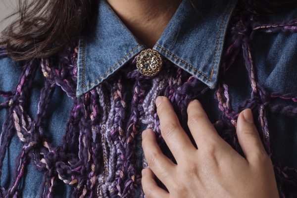 Refined Jacket overcoat made of precious yarn composed by wool yarn violet color and neckband pink /gold shades. Finished with lurex and lilac wool.