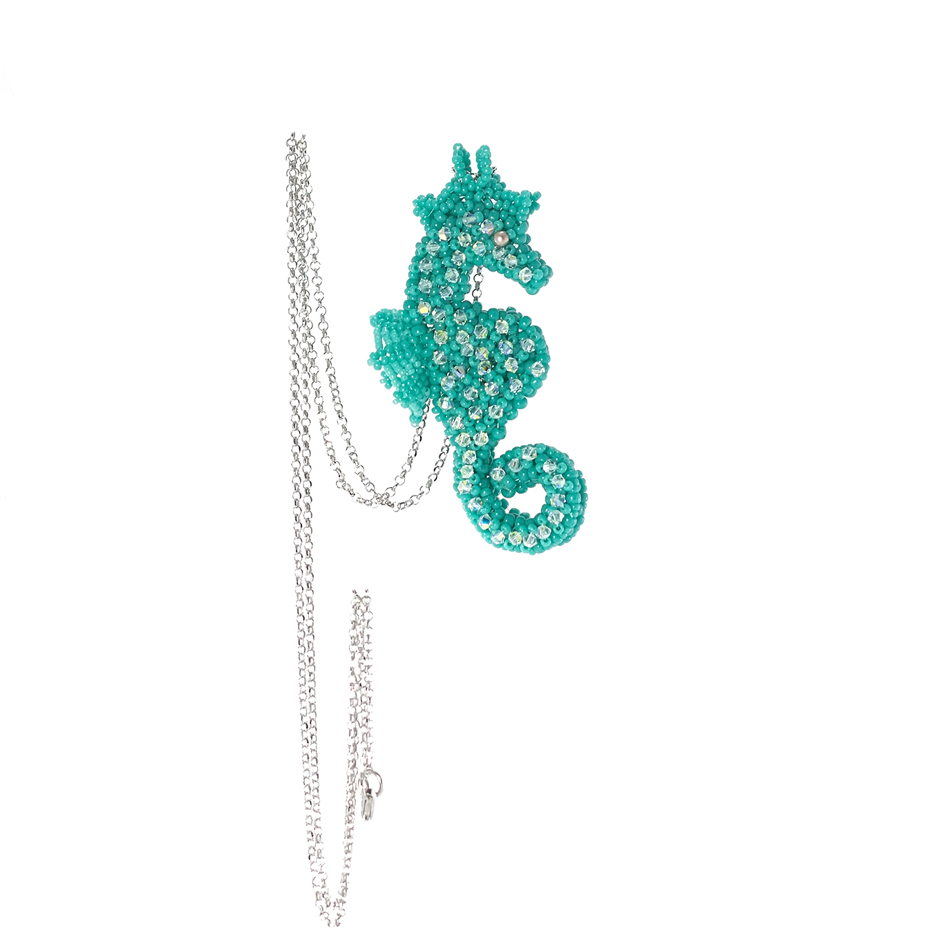 Seahorse pendant made with Miyuki beads, microbeads, bicones swarovski elements rhodium-plated silver.