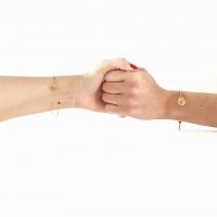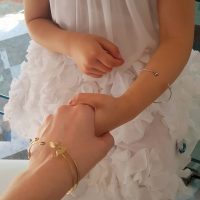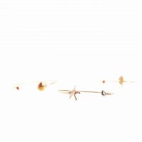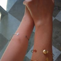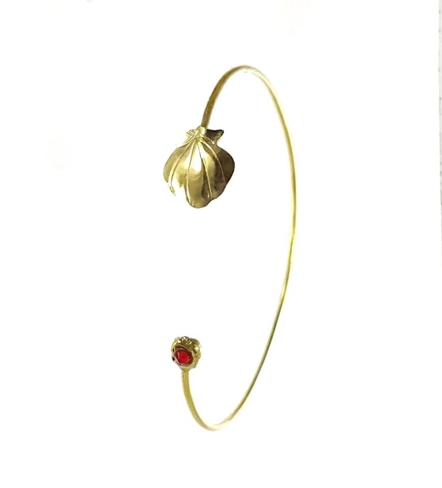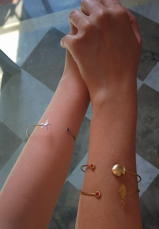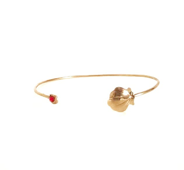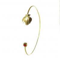 The open bracelet is enriched at both ends with a small shell and a red Swarovski-like crystal.