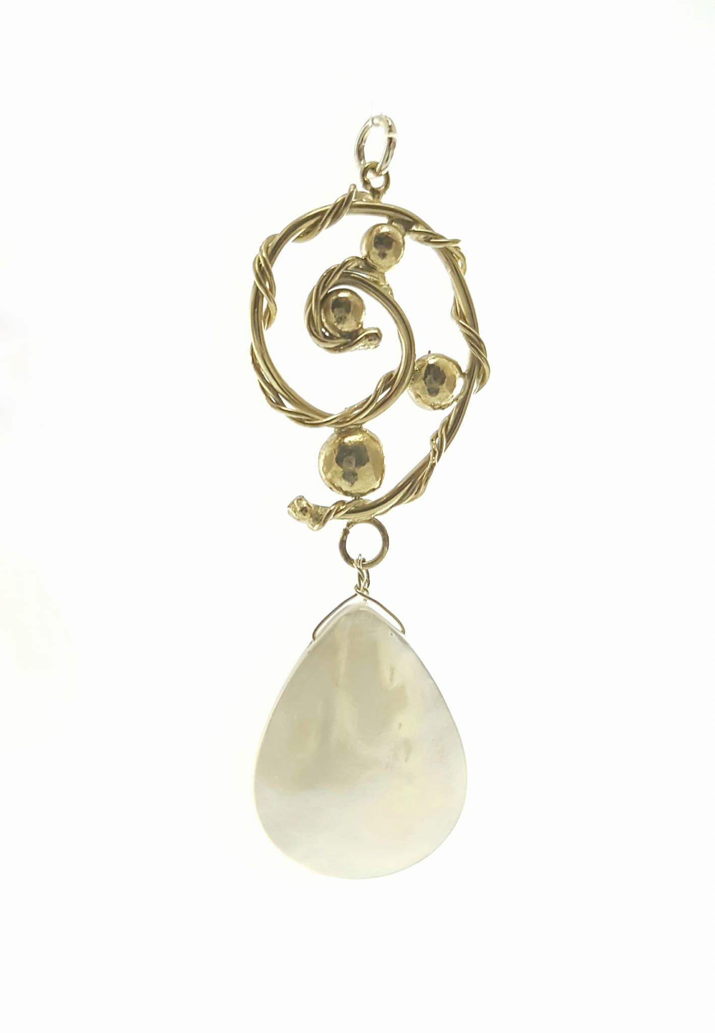 The jewel is finished with a gold-colored galvanic process and enriched with nacre stone.