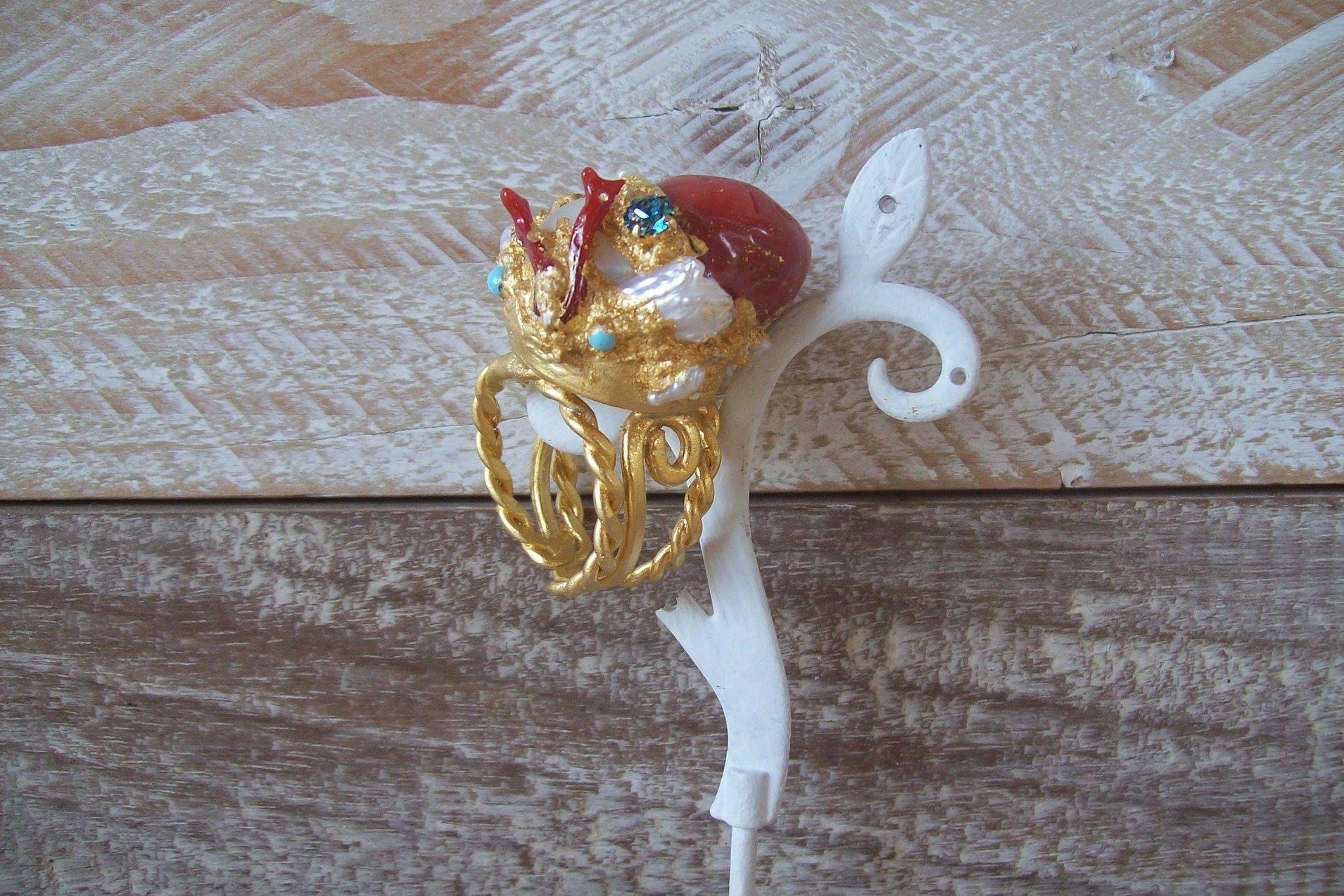 ANELLO DI OTTONE PL. ORO LAVORATO CON INCASTONATURA SU FOGLIA ORO PURO 23,75 KT DI GRANDE CORALLO, PERLE COLTIVATE E SWAROVSKI