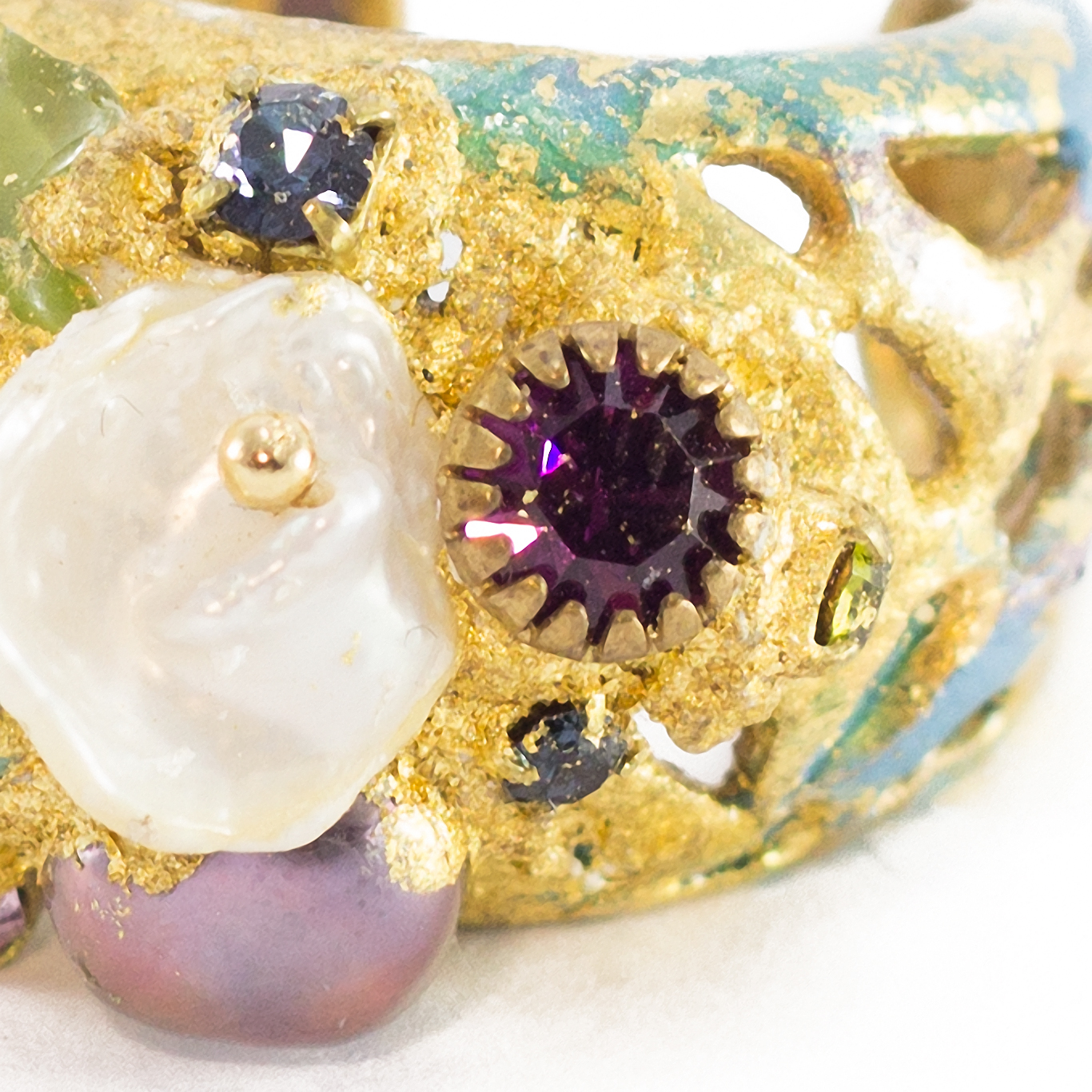 Anello di ottone placcato oro dipinto a mano con perle barocche,
