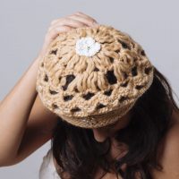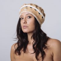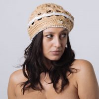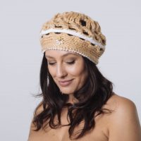 Elegante basco realizzato con morbido filato di lana colore cammello alternato da uguale filato arricchito da laminato oro.