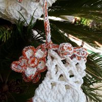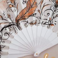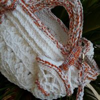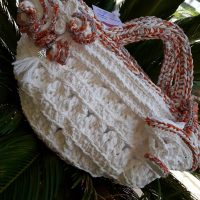 Elegante borsa estiva in grosso filato morbido e lucido composto da fibre poliacriliche e puro cotone arricchite da setosa viscosa, interamente realizzata ad uncinetto, arricchita da una deliziosa miniatura e da una spilla floreale, corredata da portacellulare coordinato, da un astuccio porta ventaglio coordinato e da un ventaglio dipinto a mano a tema. Interno decorato con una Sicilia ricamata.