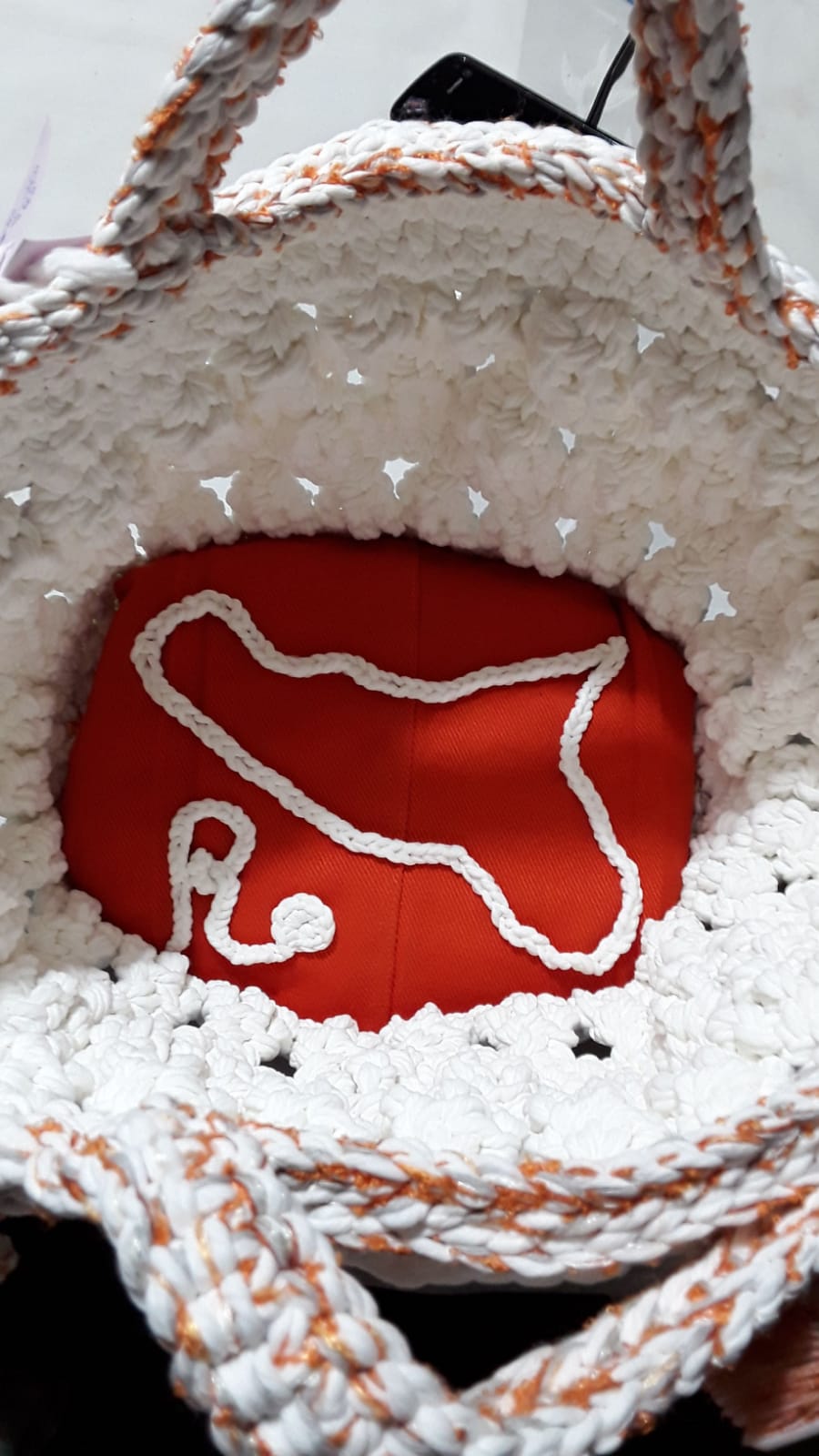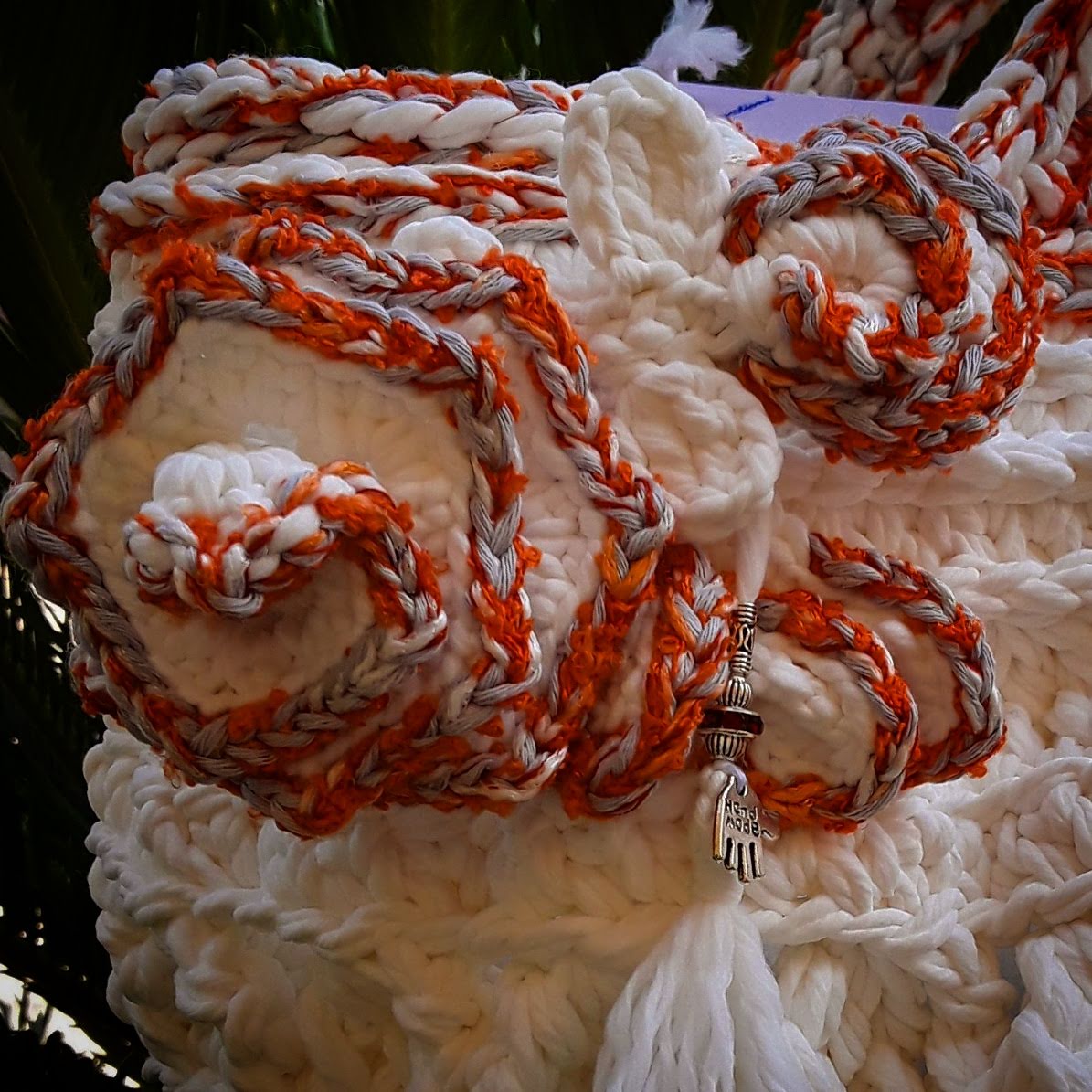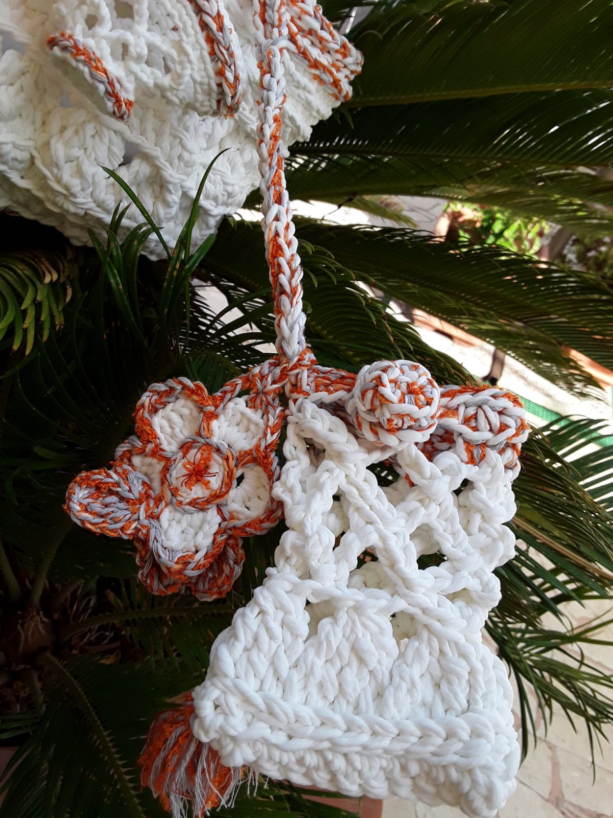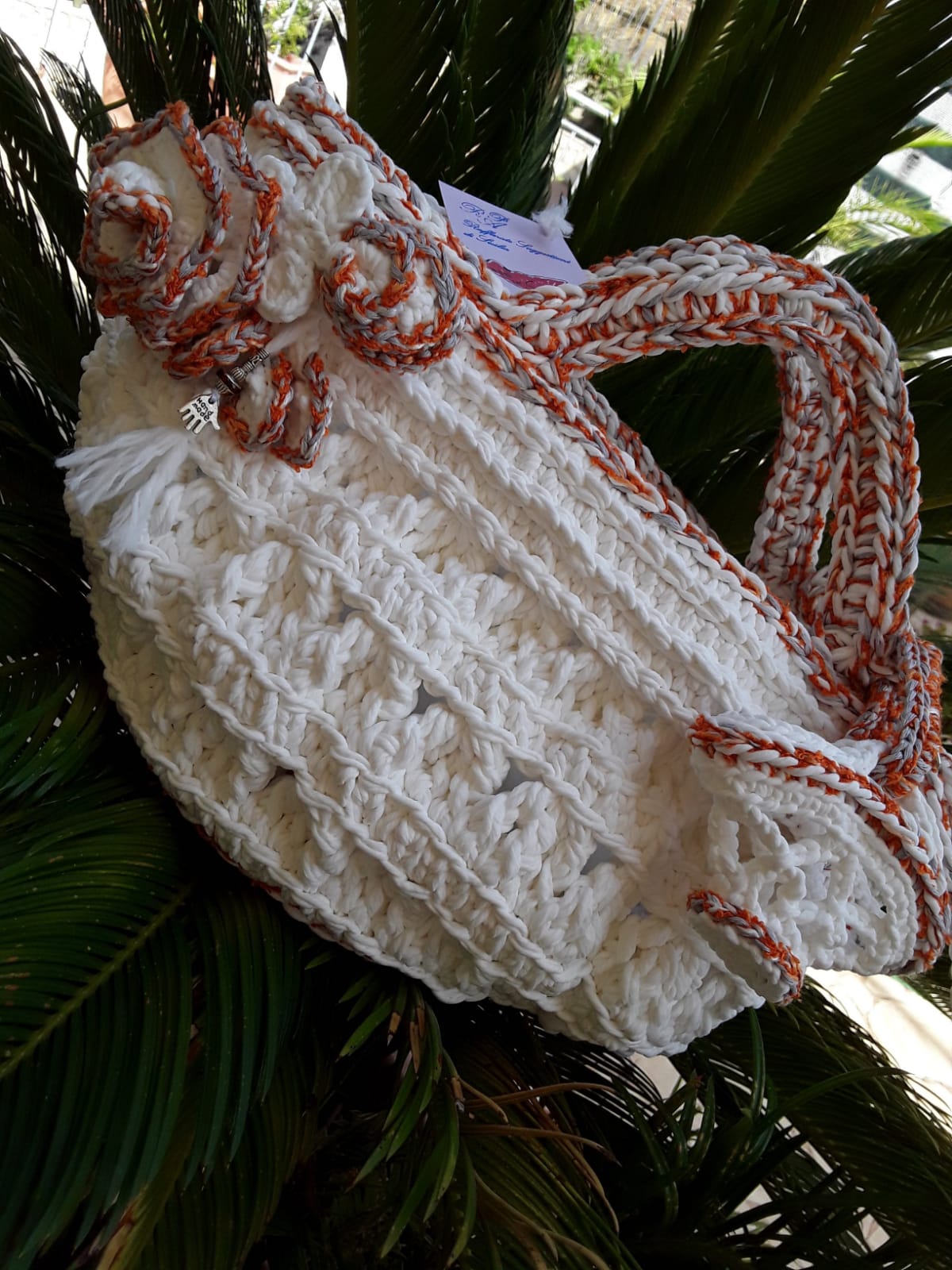 Elegant summer bag in big soft and shiny yarn composed of polyacrylic fibers and pure fine and smooth cotton, made entirely crocheted, enriched by a delicious miniatures and floreal brooch, accompanied by cell phone cover coordinated, by fan cover coordinated and by handmadepainted fan. Interior decorated with an embroidered Sicily.