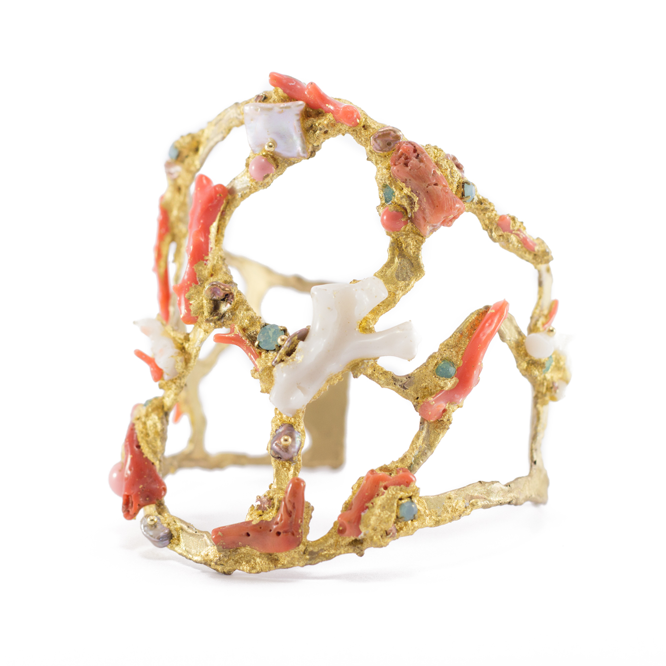 Corallo rosa, cristalli e perle barocche incastonate su foglia oro puro 22kt.