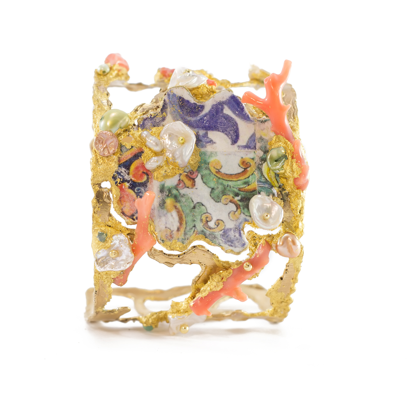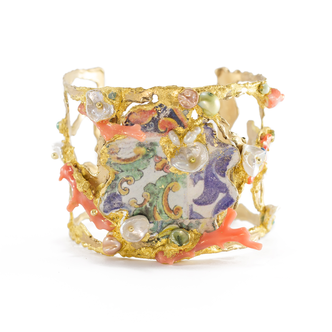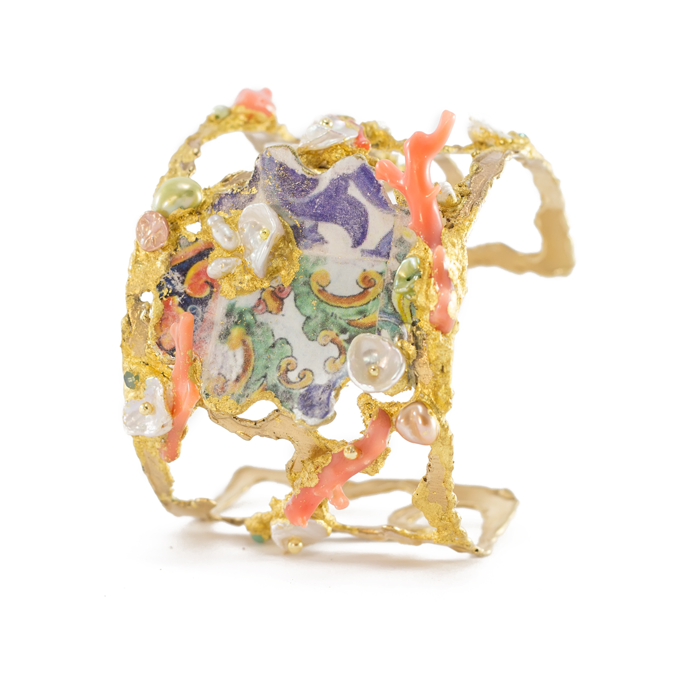 Bracciale di ottone galvanizzato realizzato artiginalmente con riproduzioni di maioliche siciliane,