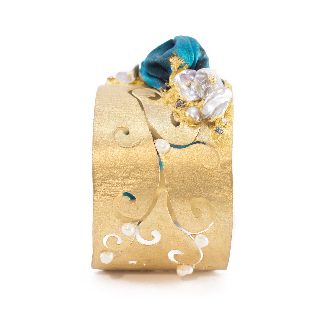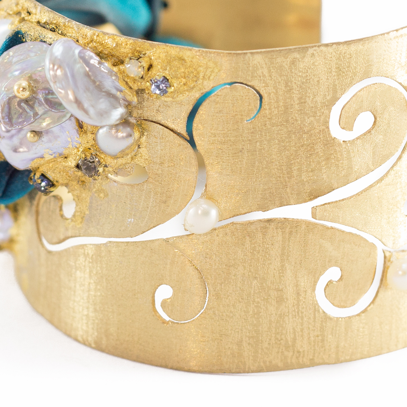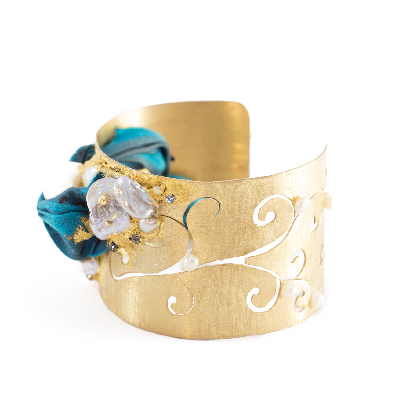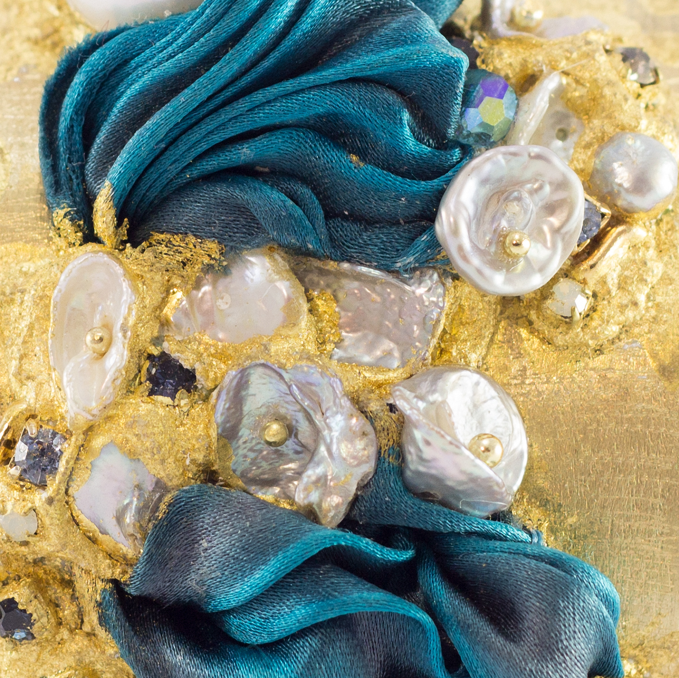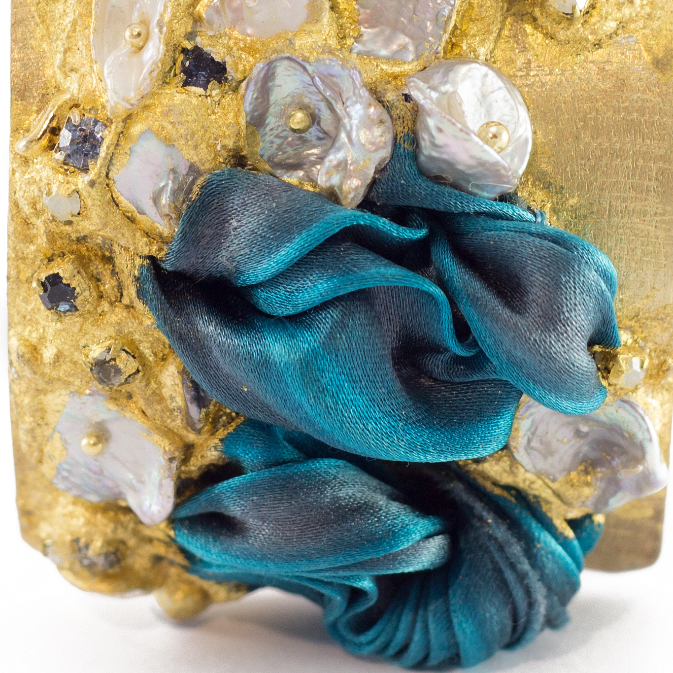 seta shibori dipinta a mano, strass, perla scaramazza e perle barocche coltivate in acqua dolce.