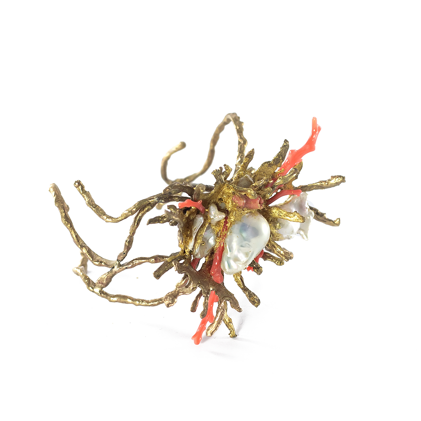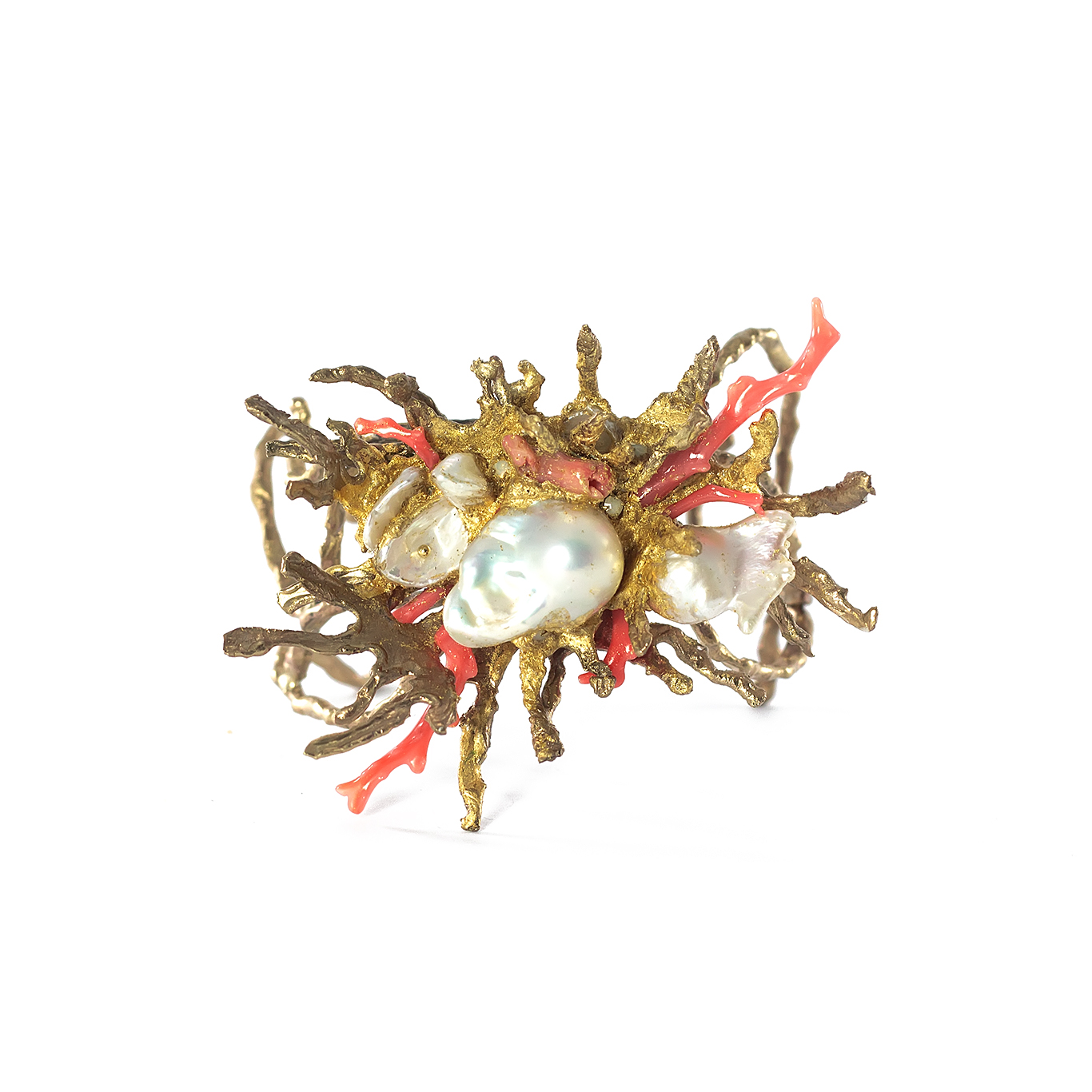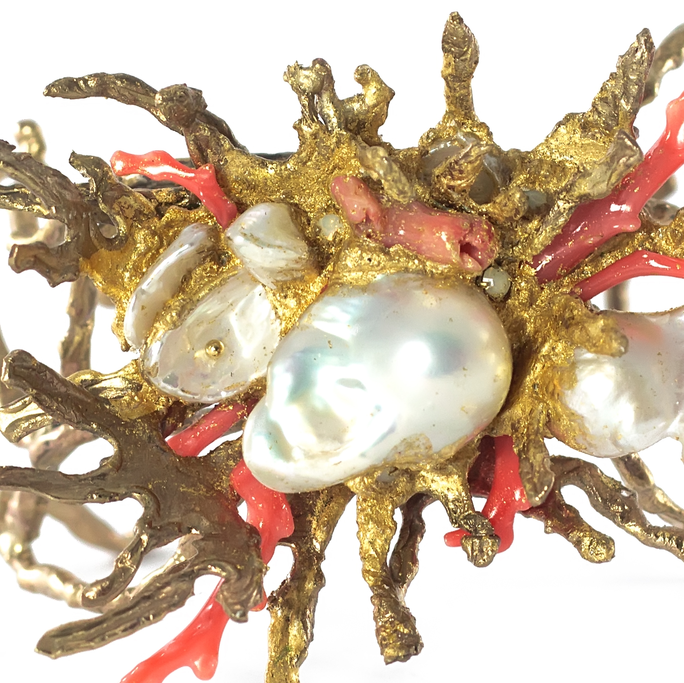 con grandi perle scaramazze e corallo rosa incastonati su foglia oro puro 22 kt.