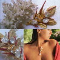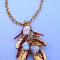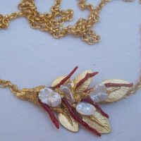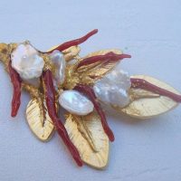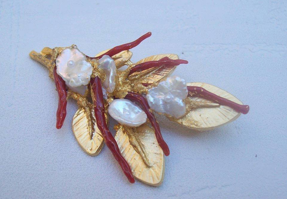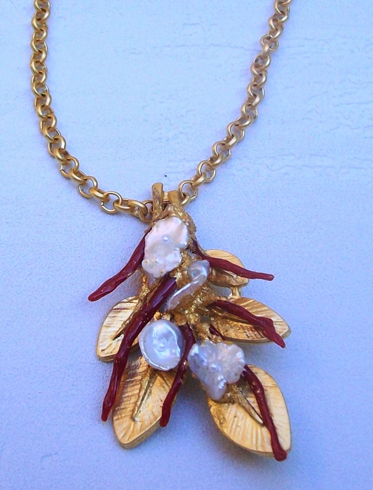 Ciondolo foglia di ottone pl. oro lavorato con rami di corallo rosso e perle barocche coltivate in acqua dolce incastonate su foglia oro puro ,indossabile orizzontale e verticale ,con collana regolabile di ottone pl. oro