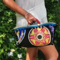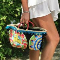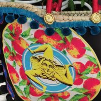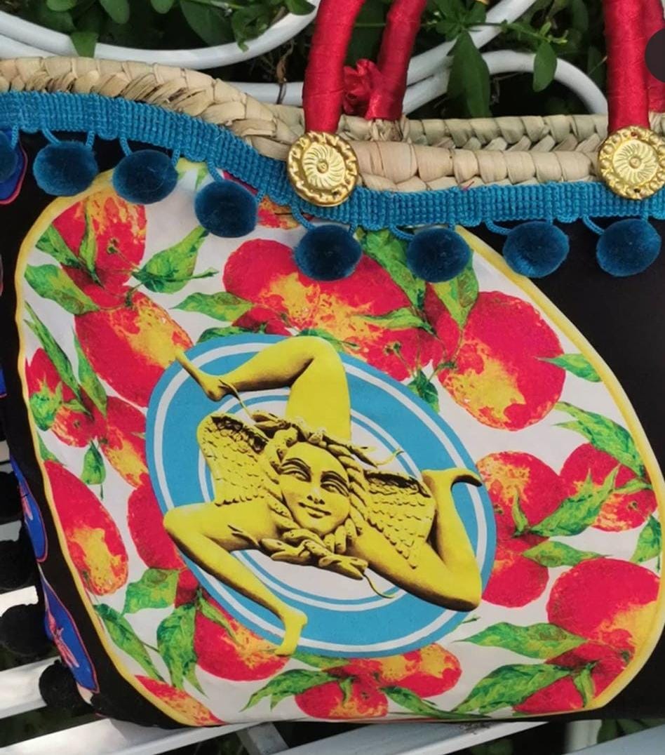 Arricchita con passamaneria azzurra e borchie dorate, chiusura a sacco.