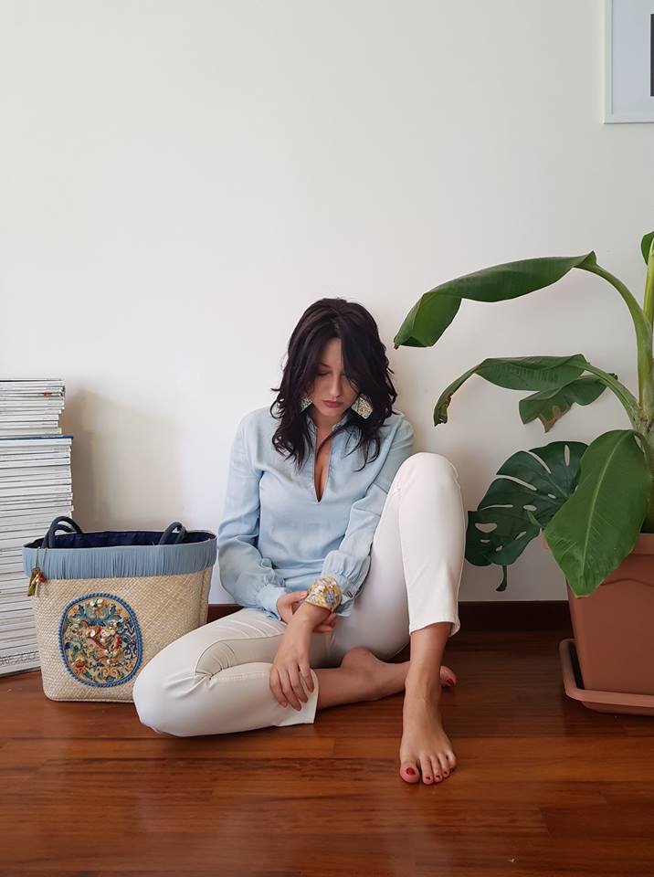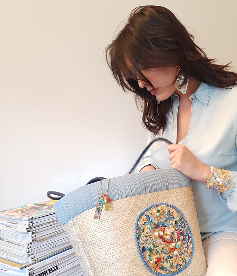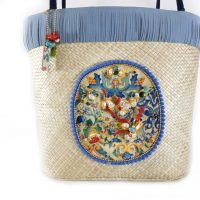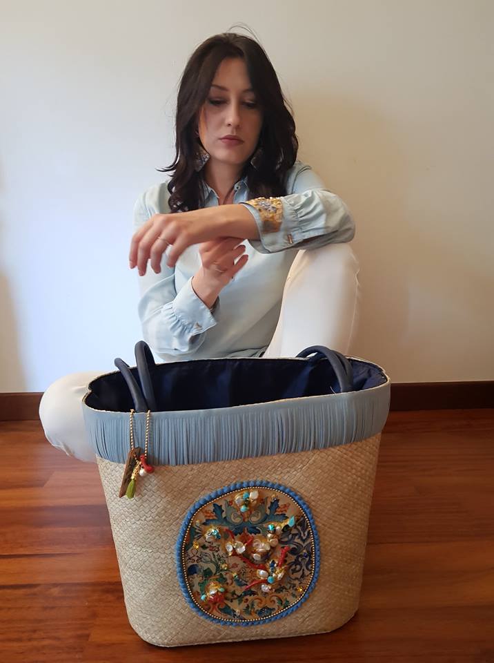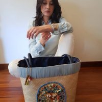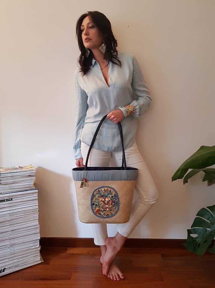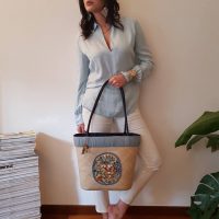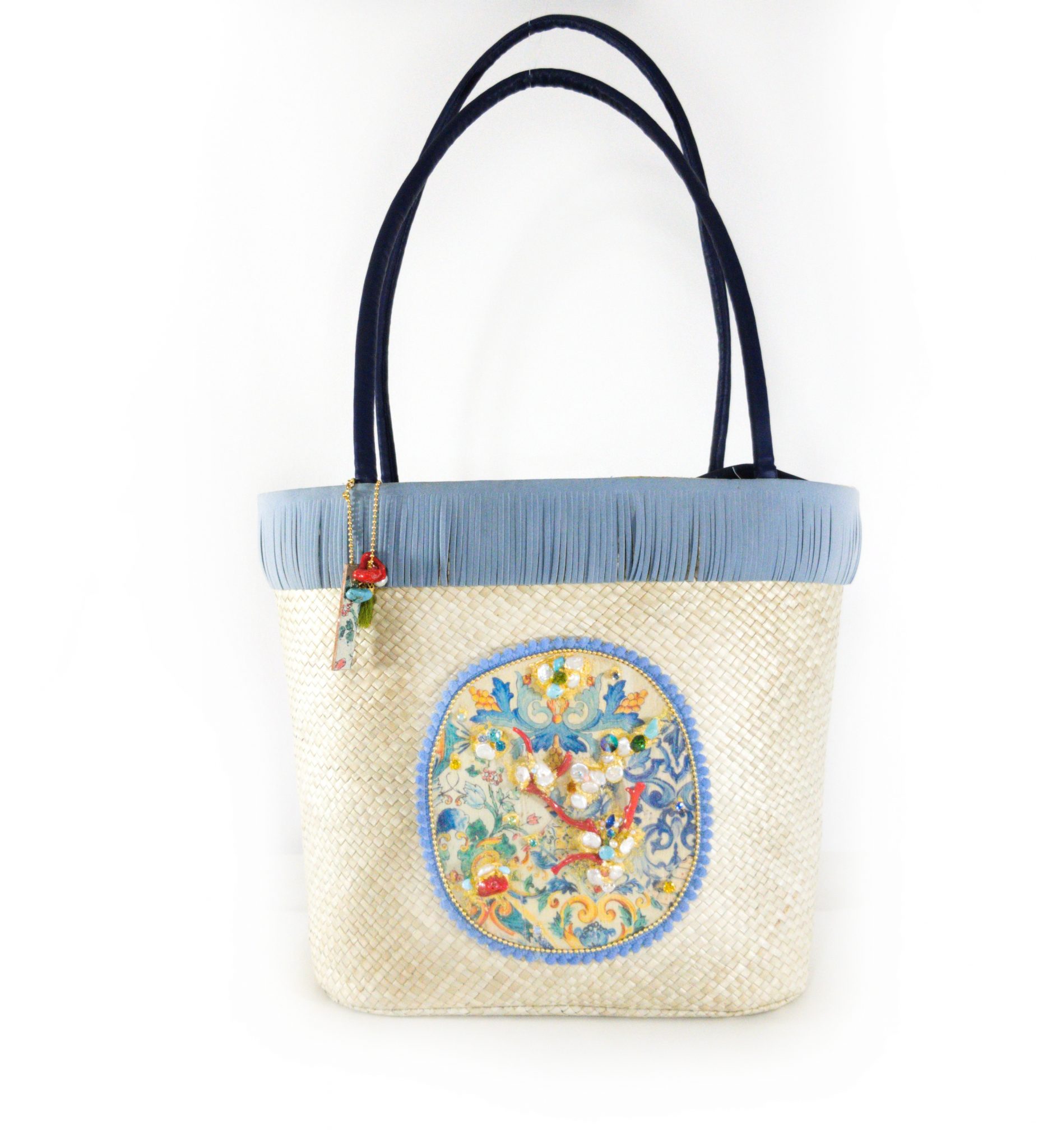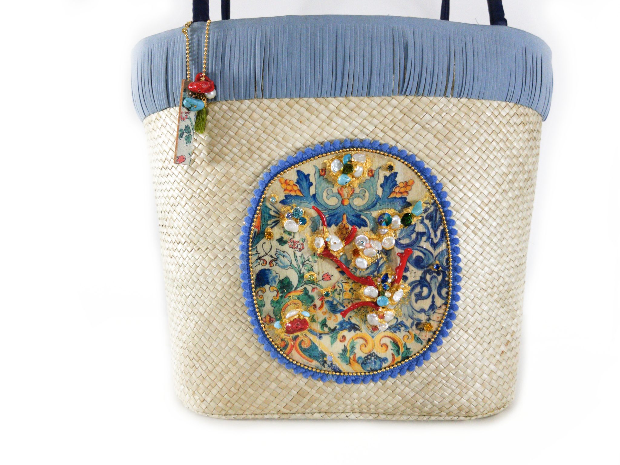 Borsa arricchita con decorazione lavorata interamente a mano su base di legno, trasferimento d’immagine con effetto mosaico raffigurante le maioliche elementi tipici della tradizione siciliana.