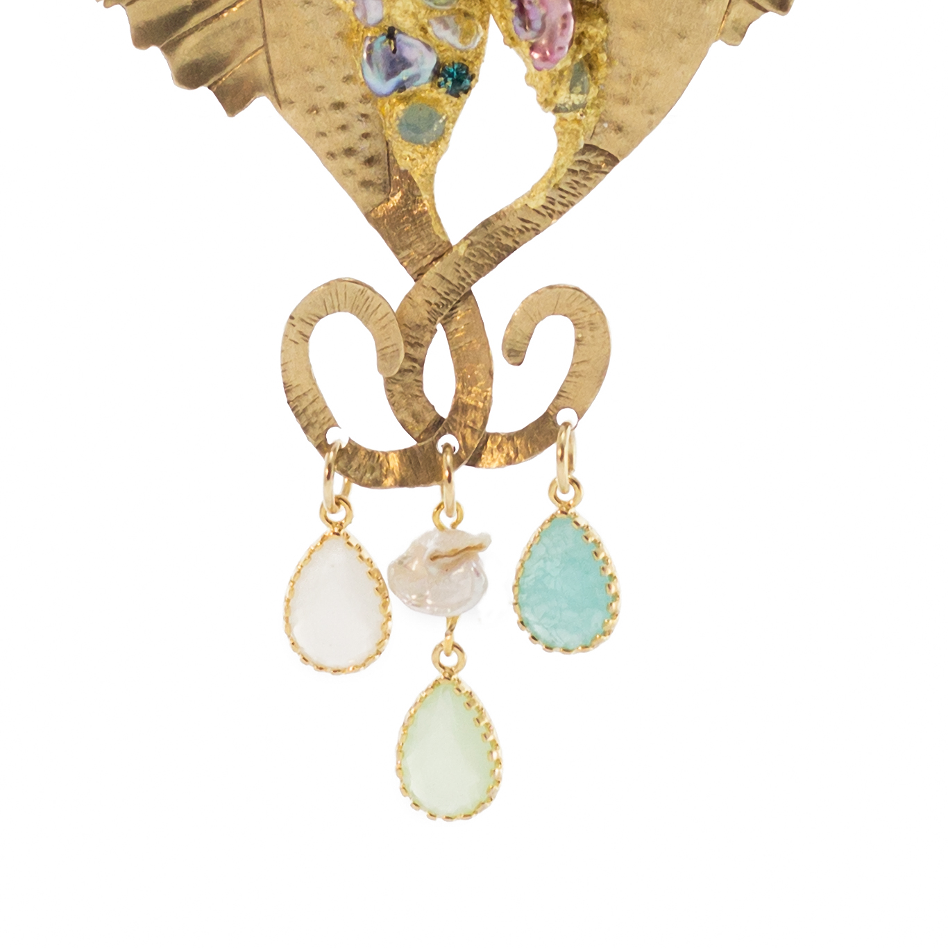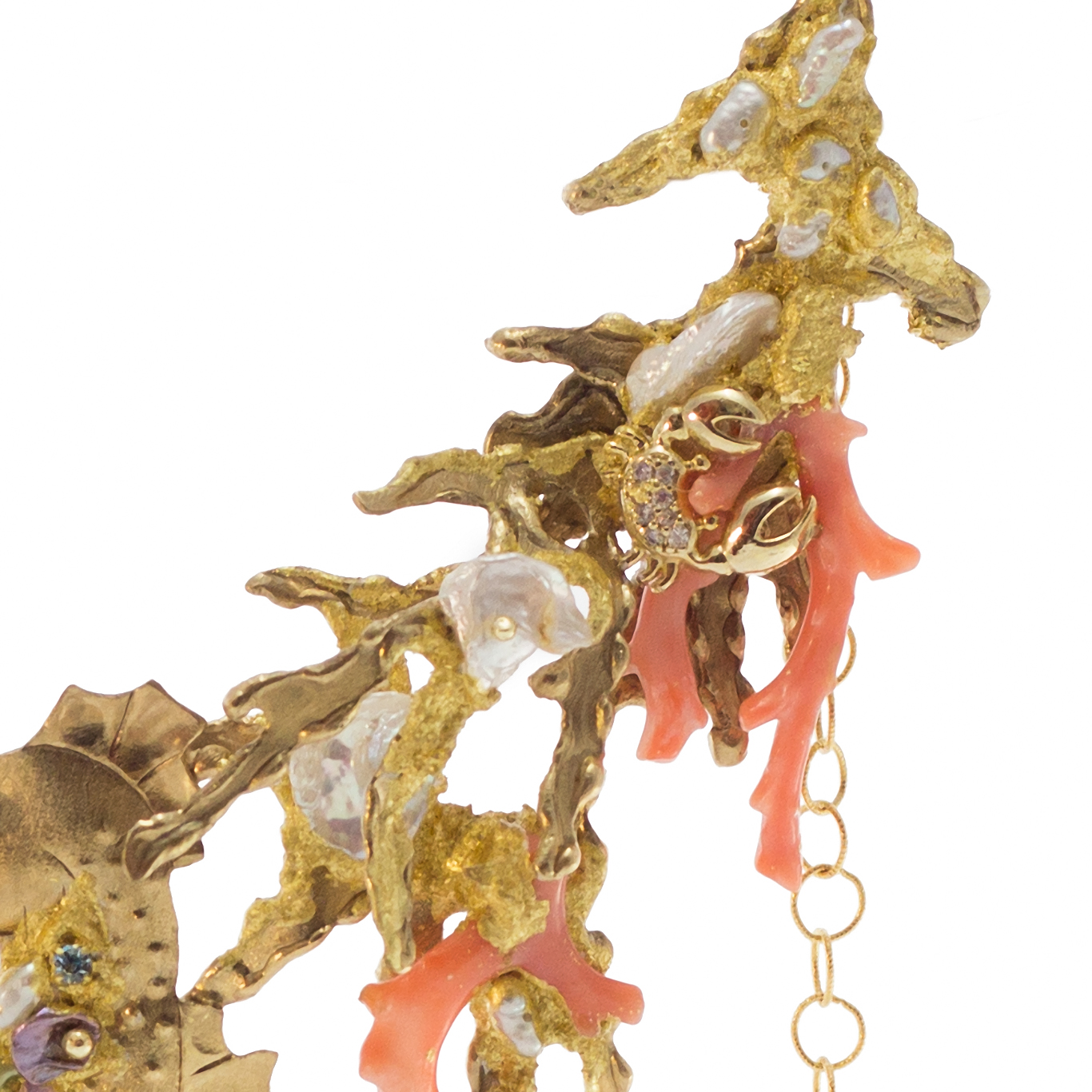 perle barocche coltivate in acqua dolce, strass, swarosvki e cristalli incastonati su foglia oro 22 kt.