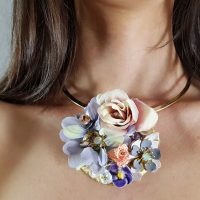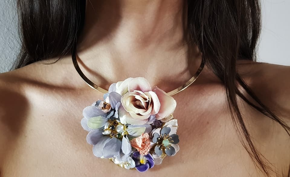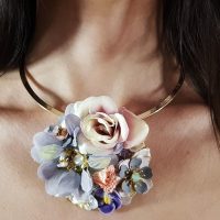 Collarino Primavera. Collarino rigido con medaglione lavorato con fiori di stoffa, perle barocche, cristalli swarovski, fiori di metallo e di ceramica smaltati ed incastonati su foglia oro puro.