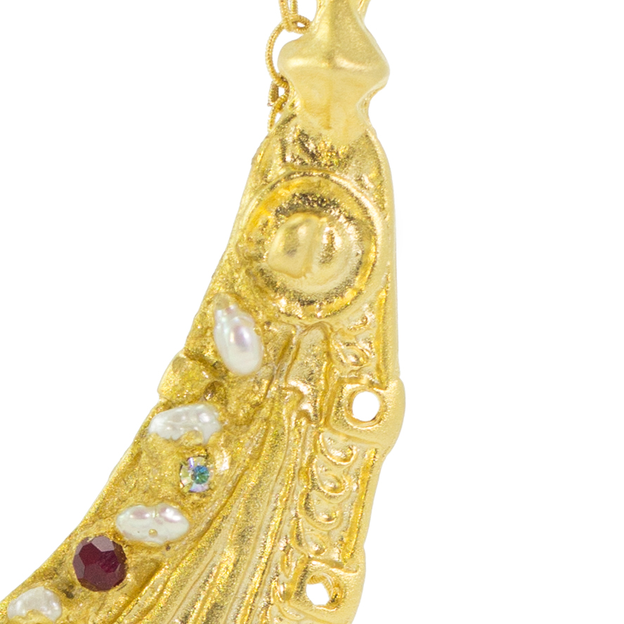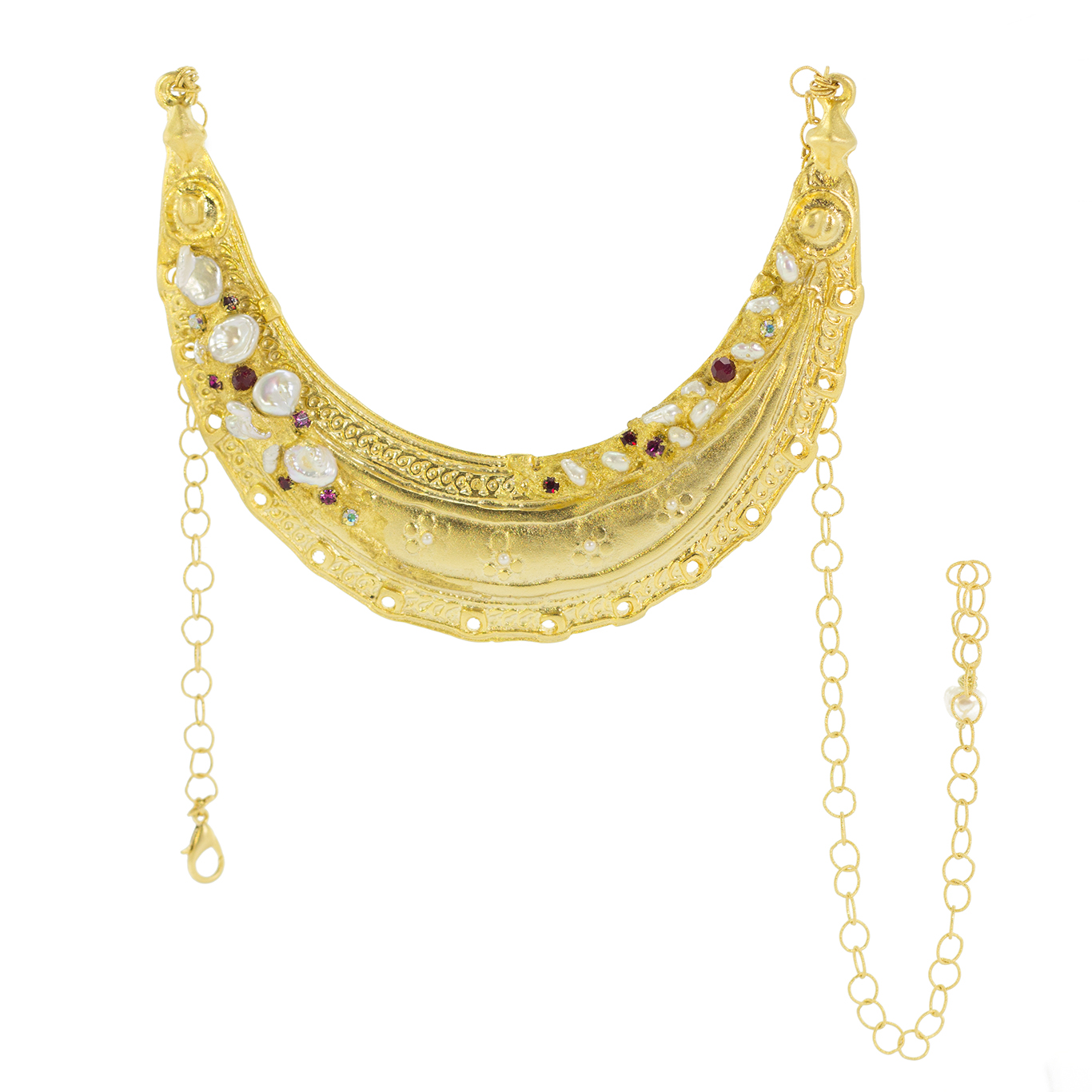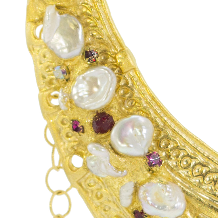 Collana rigida di ottone placcato oro lavorato con perle barocche coltivate in acqua dolce,