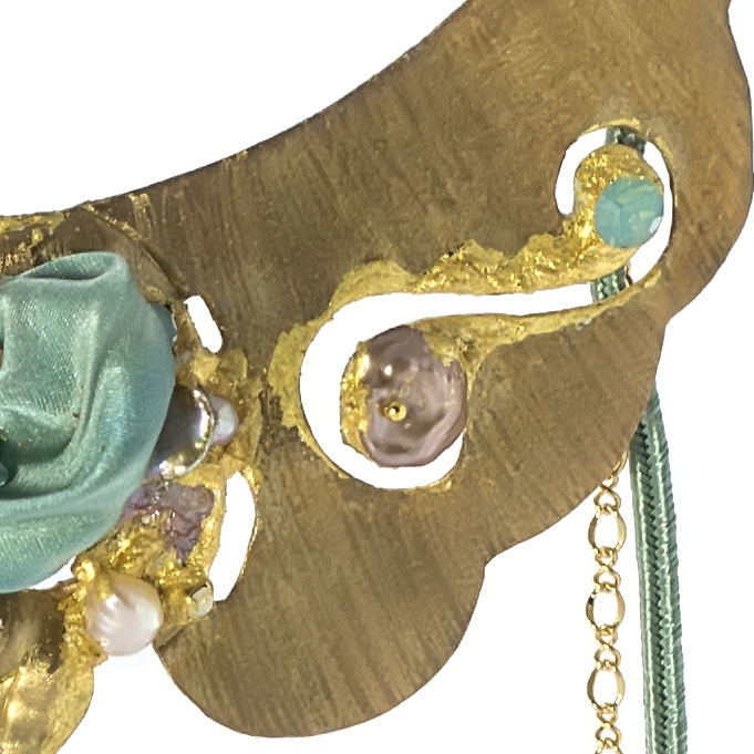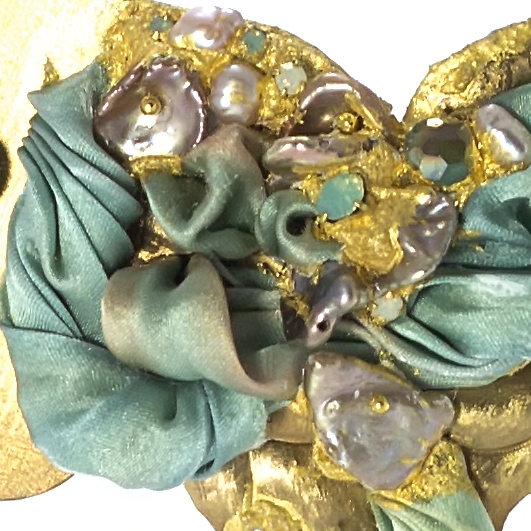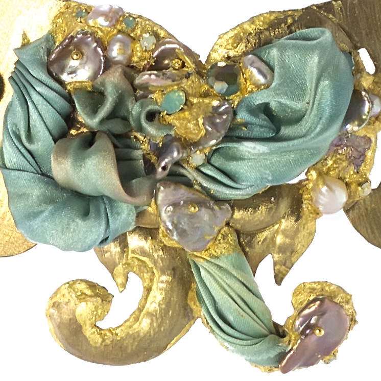 cristalli swarovski e perle barocche d’acqua dolce incastonati su foglia oro puro 22 kt.