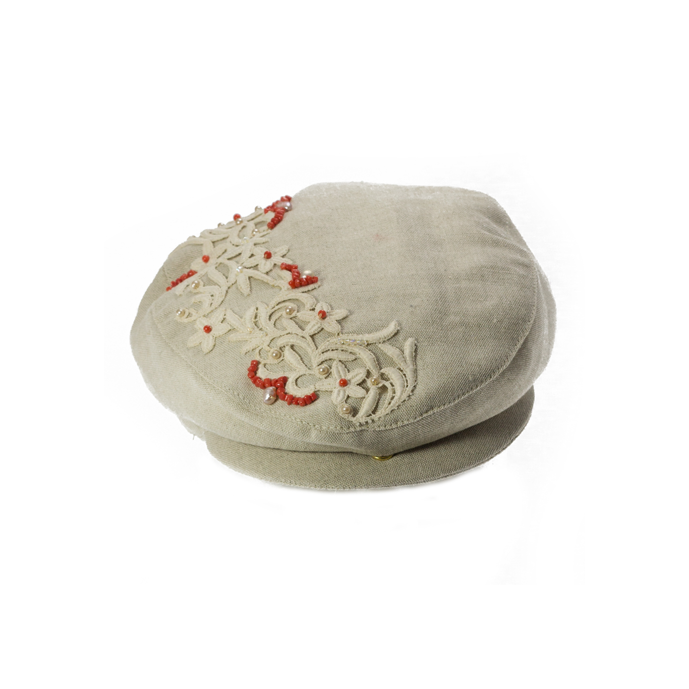 Cappello di lino con applicazioni di pizzo macrame’, coralli, perle swaroski e cristalli.