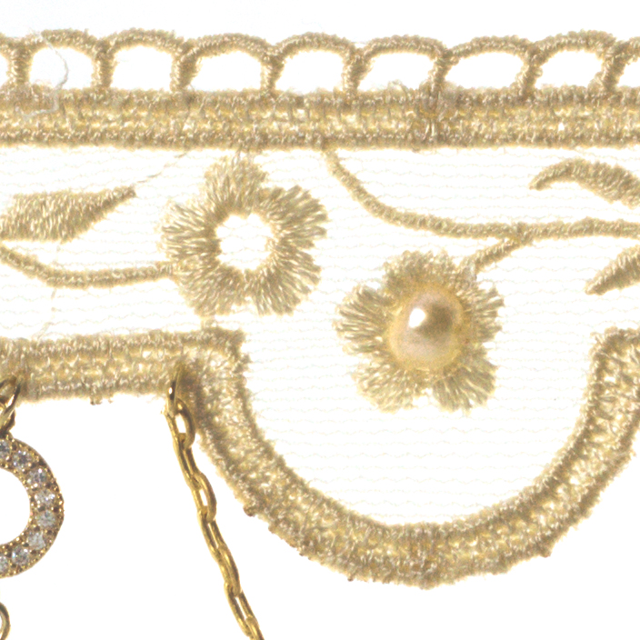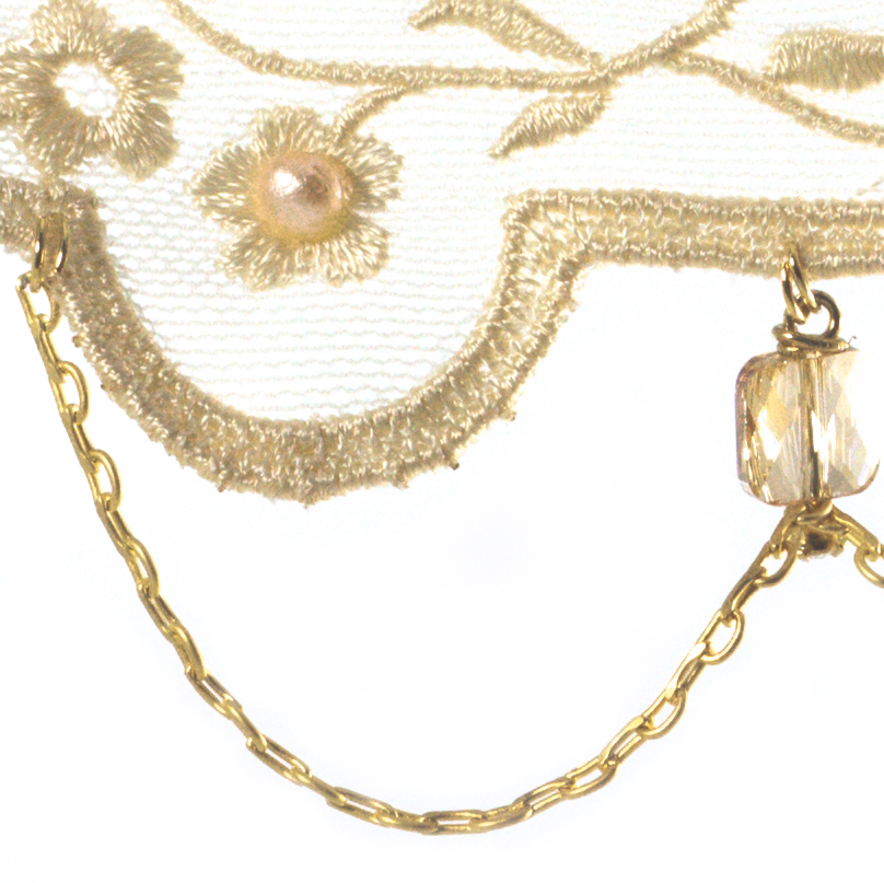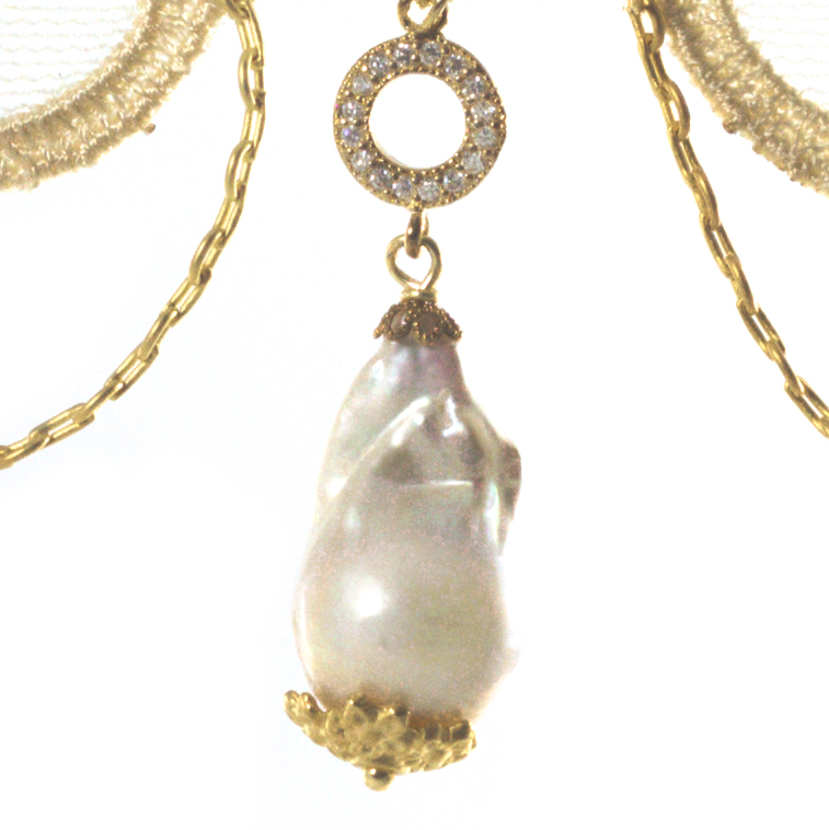 Elementi in ottone placcati oro 22kt, Swarovski, strass e perle scaramazze d’acqua dolce. 32 cm