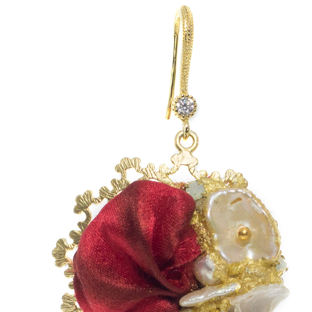 Seta “shibori”, perle barocche d’acqua dolce e cristalli Swarovski incastonati su foglia oro 22kt.