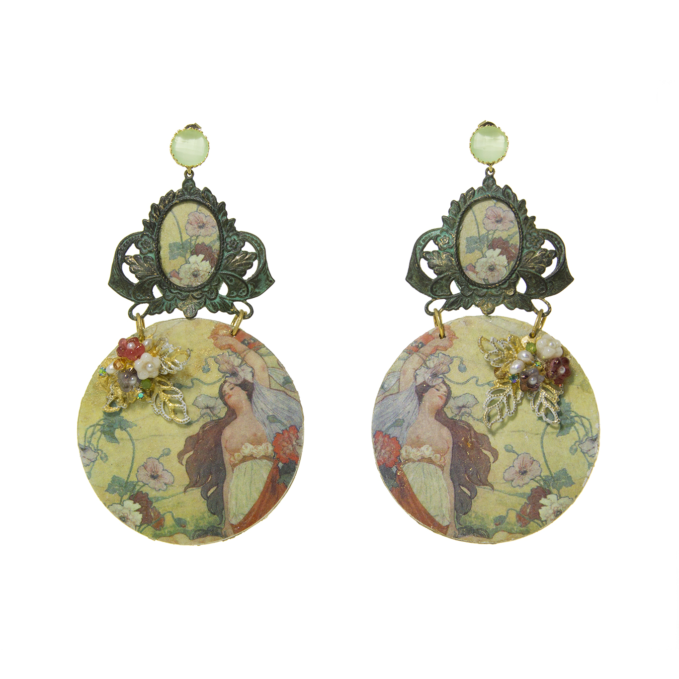 Orecchini realizzati con la tecnica di trasferimento d’immagine su legno, lavorati a mano, incastonatura di fiorellini di vetro boemo, perle di fiume e cristalli incorniciati su foglia oro puro 23,75 kt.