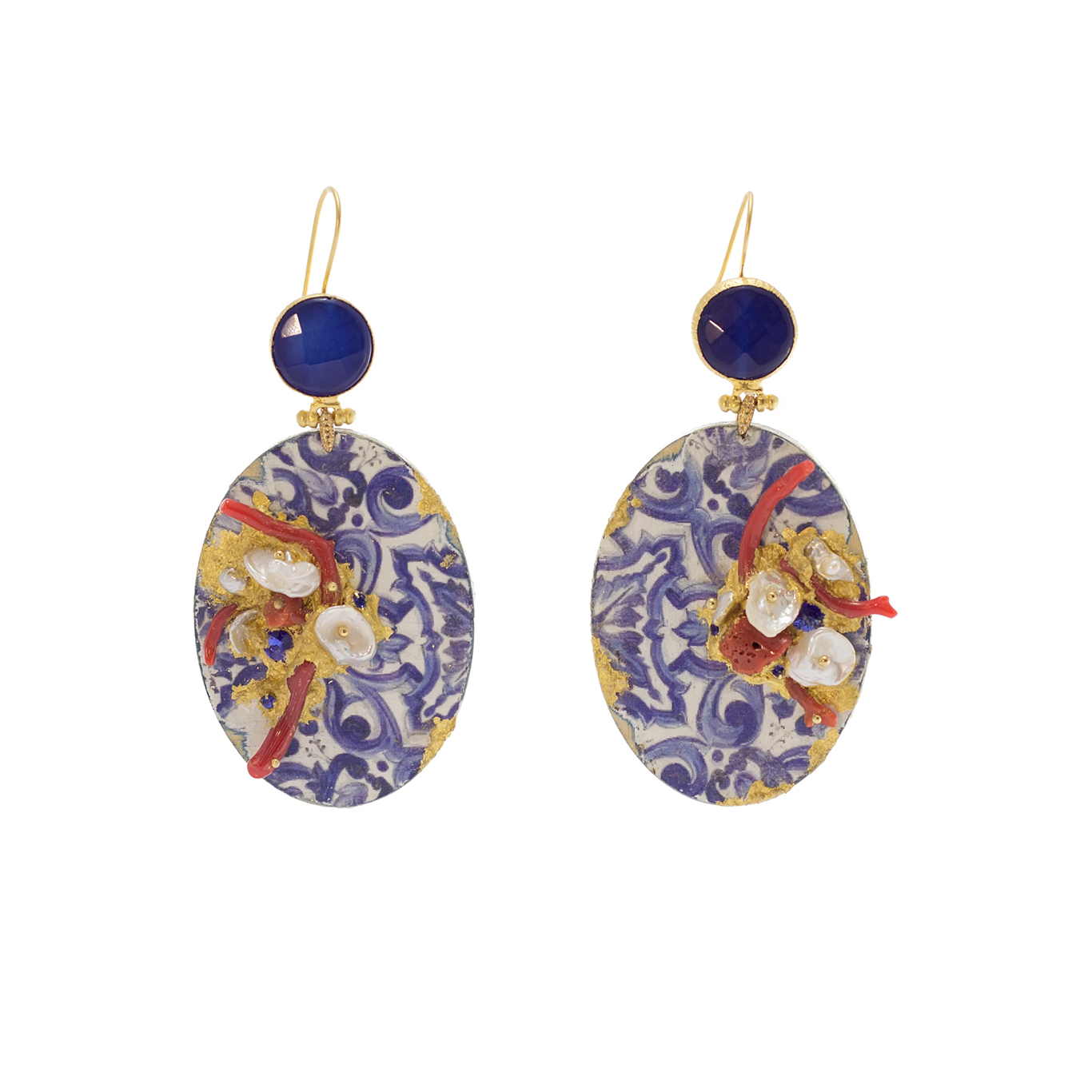 Incastonatura su foglia oro puro 22 kt di corallo perle barocche coltivate in acqua dolce e cristalli swarovski.