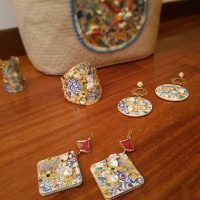 Orecchini di legno lavorati con la tecnica di trasferimento di immagine,
