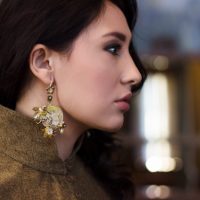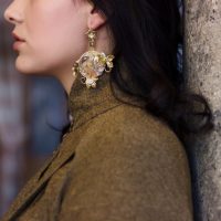 Perle barocche coltivate in acqua dolce, fiorellini in vetro boemo, cristalli e swarosvki incastonatura su foglia oro puro 23,75 kt.