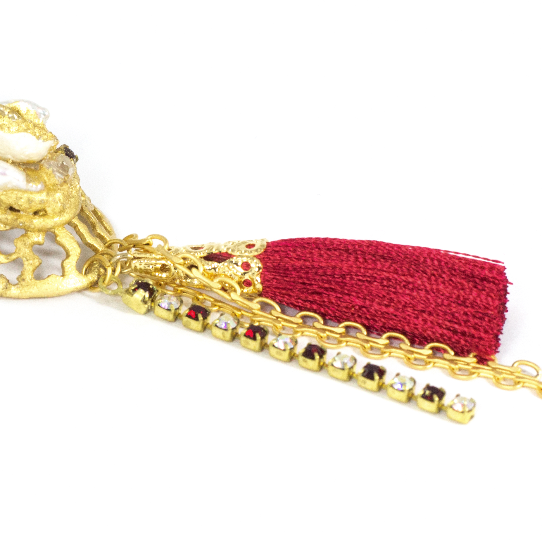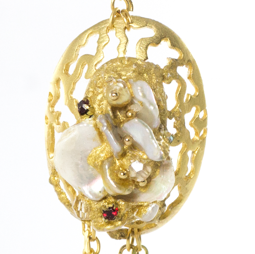 Perle barocche d’acqua dolce, cristalli e strass incastonati su foglia oro 22 kt.