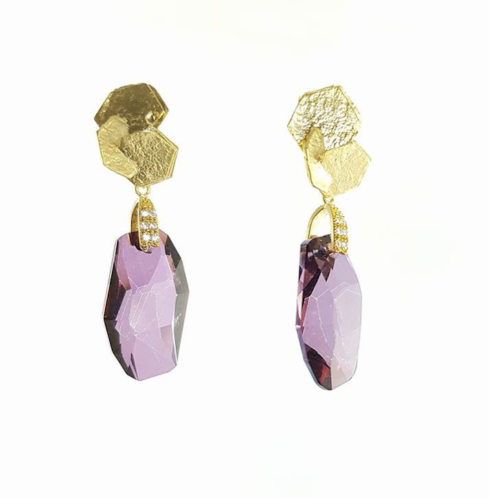 Orecchini d’ ottone placcato oro, grande pendente di cristallo swarovski colore “plum purple”.
