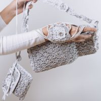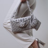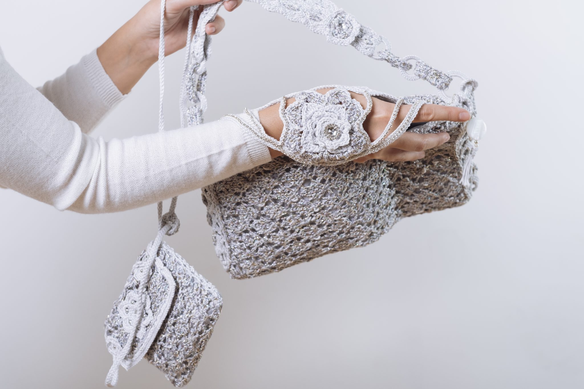 Prezioso set di borse realizzato con filato laminato colore argento arricchito da fili lurex multicolor alternato a filato puro cotone colore ghiaccio.