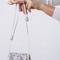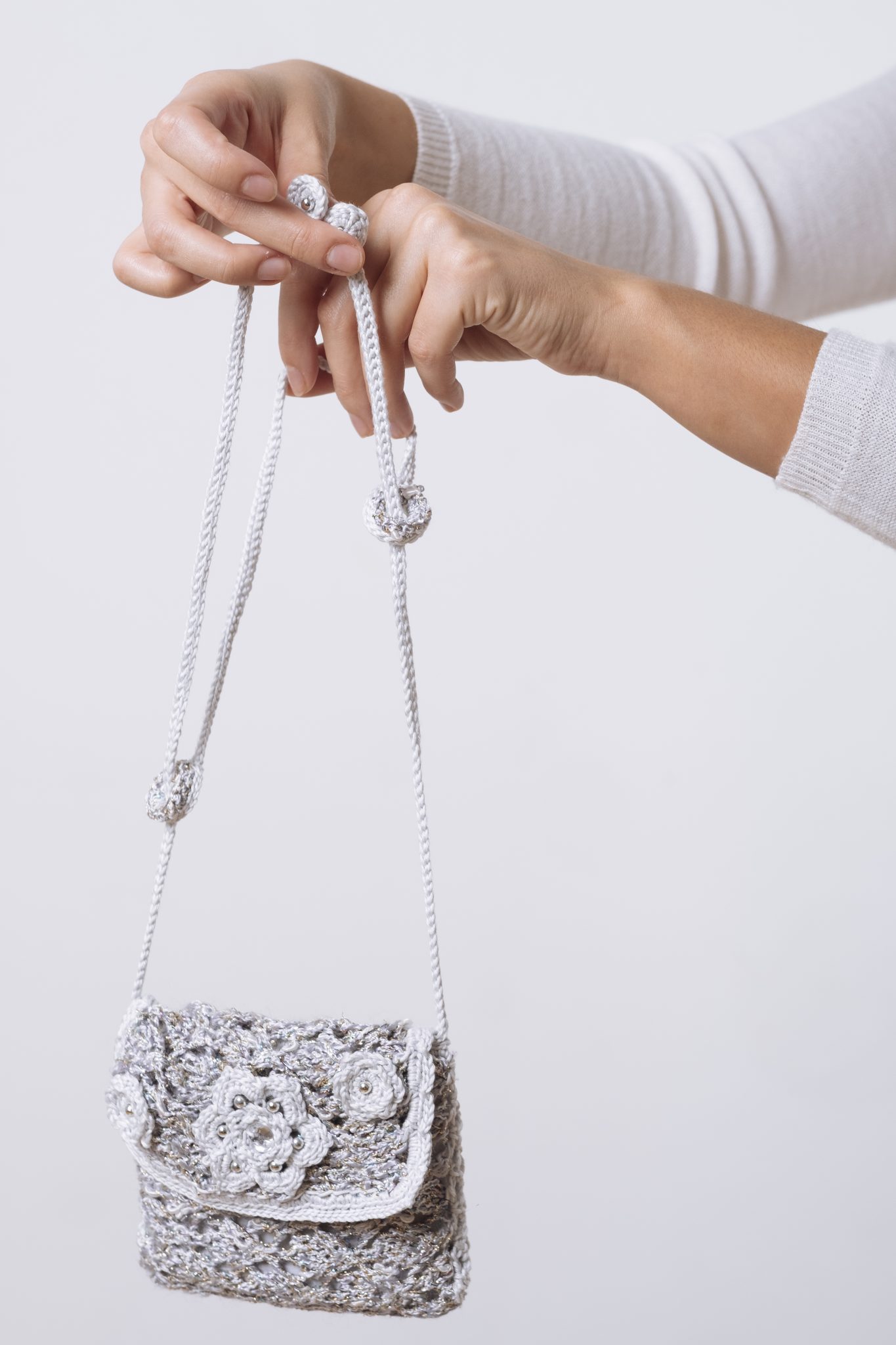 BORSA: Raffinata trama composta da una fantasia di rombi impreziosita da una grande rosa a rilievo, realizzata interamente a mano, applicazione di strass in vetro e mini sfere color argento. Bretella manico interamente uncinetto. Fodera satinata colore argento.